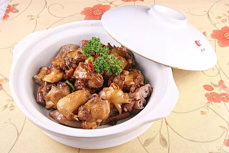 三杯鸡是江西传统名菜,因其烹制时不放汤水,仅用米酒一杯,猪油一杯,酱油一杯,故名三杯鸡。说起三杯鸡还得回到200多年前,江西宁都县有一对父母双亡,相依为命的姐弟。一天,弟弟要出外学生意。临行前,姐姐将自养不到一年的母鸡宰了,剁成小块,用一个带盖的土钵装上。顺手用小茶盅往钵里倒了一杯酱油、一杯猪油、一杯米酒,但忘了往钵子里加水,就端在灶上烧。过了一会,一股浓郁香味扑鼻而来,鸡也烂了,色也上了,汤也干了,味道既鲜又美。隔壁的官厨,闻香而来,一尝拍案叫绝。细究其由后,官厨信口名之:"三杯鸡",故此得名。