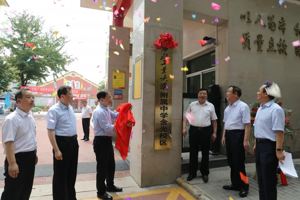 6月12日下午,西北工业大学附属中学含光校区挂牌,标志着西工大附中“一长多校”委托管理含光中学正式落地实施。这是西安碑林区委、区政府深入贯彻落实市委、市政府教育改革工作要求,勇于打破体制壁垒、积极探索教育发展新路径的一项创新举措,对于扩大公办优质教育资源规模、打造独具碑林特色的优质公办中学教育圈、办好人民满意的教育具有重要意义。碑林区委书记刘其智,西北工业大学党委常委、副校长杨益新,区委常委、常务副区长王宏联,区委办公室主任张博,区教育局党委书记、局长冯洁及班子成员,西北工业大学附属中学校长王永智及班子成员,西安市含光中学全体班子成员及教职工代表共同出席了揭牌仪式。