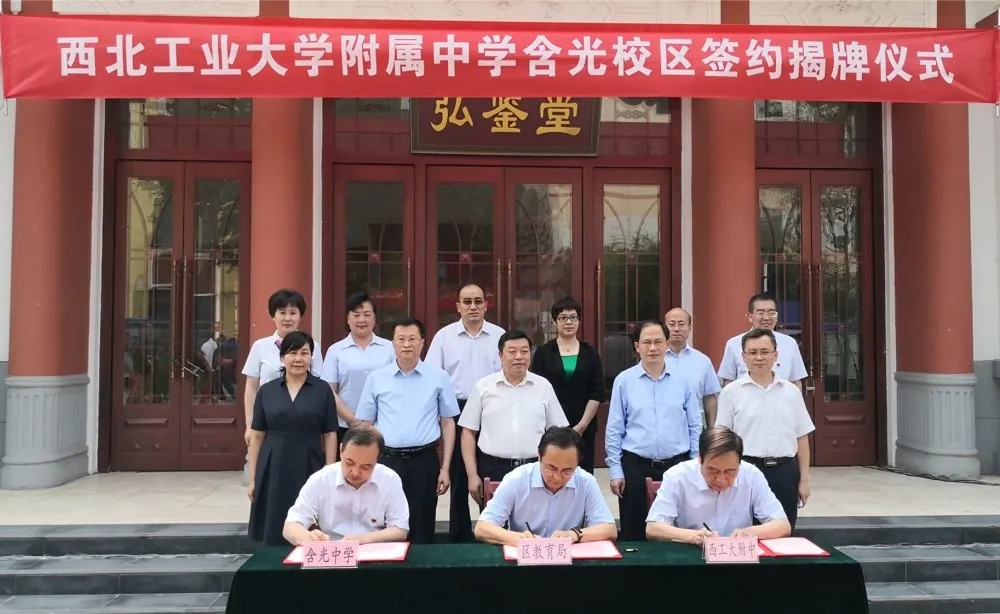 仪式最后,西安碑林区委书记刘其智,西北工业大学党委常委、副校长杨益新,区委常委、常务副区长王宏联,区教育局党委书记、局长冯洁,西北工业大学附属中学校长王永智,西安市含光中学校长周昕涛,共同为西北工业大学附属中学含光校区揭牌。(通讯员 林佳)