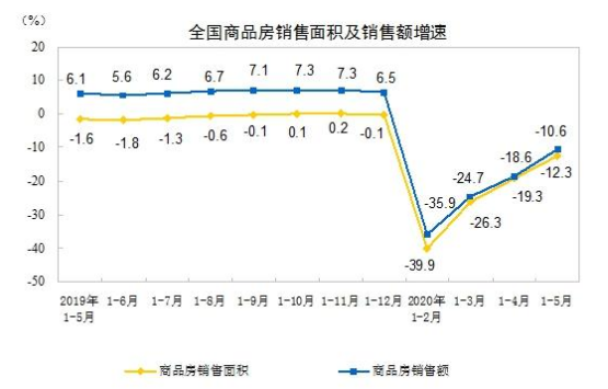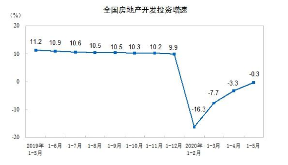 据国家统计局网站消息,国家统计局15日公布2020年1—5月份全国房地产开发投资和销售情况。1—5月份,全国房地产开发投资45920亿元,同比下降0.3%,降幅比1—4月份收窄3.0个百分点。其中,住宅投资33765亿元,同比持平,1—4月份为下降2.8%。