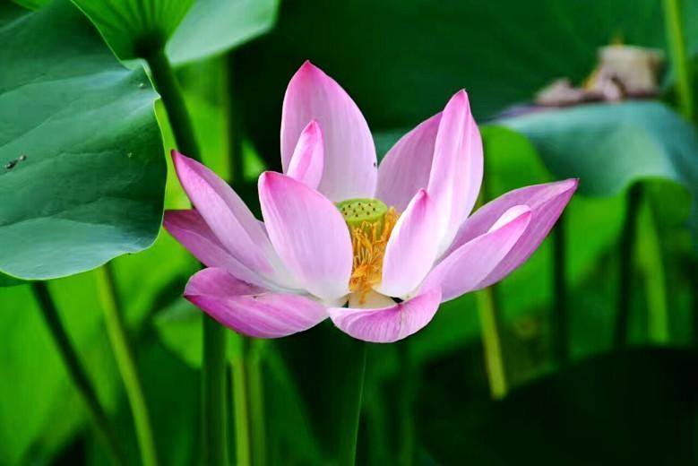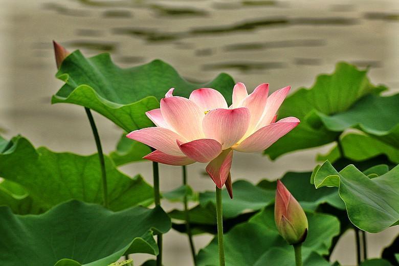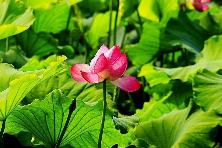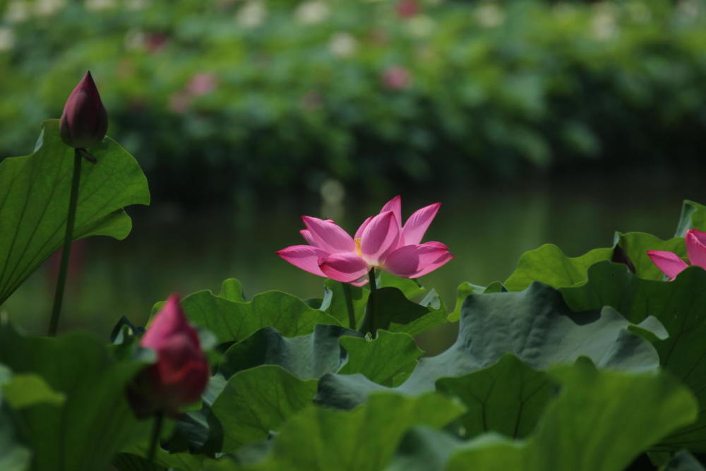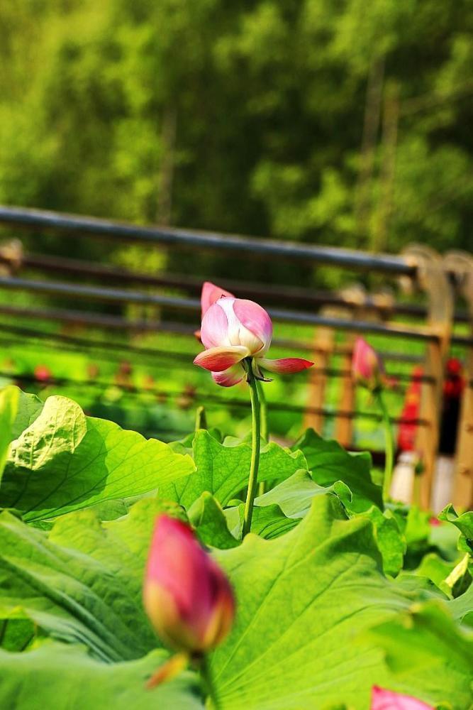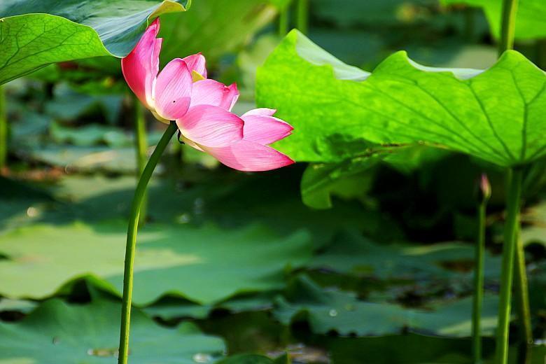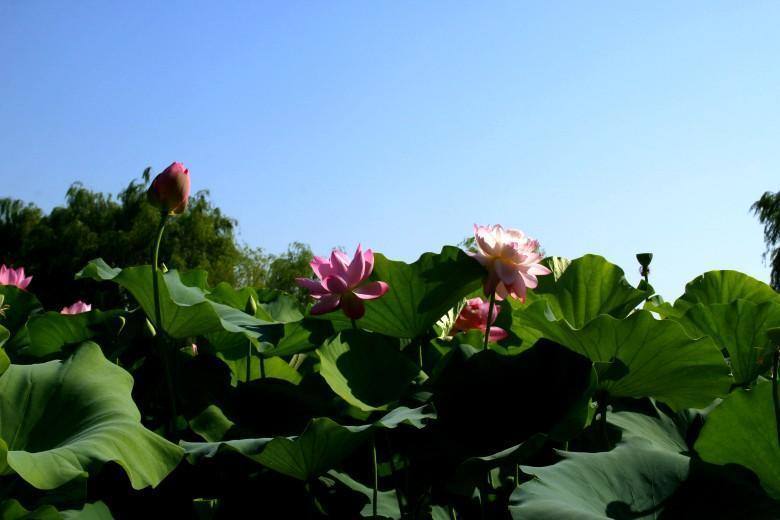 爱荷花,喜欢她的淡淡清香,喜欢她的亭亭玉立,喜欢她的出淤泥而不染,喜欢她的濯清涟而不妖。在兴庆公园的西南角,有一片荷花池,这里盛开的粉色荷花和成片的绿色蒲页,仿佛成了也有一片荷花开得甚是美丽。看到它们,就能真切体会陶渊明“出淤泥而不染,濯清涟而不妖”的千古名句。”清水出芙蓉,集花、叶、香三美于一体的荷花是夏日荷花池中的仙子,成为吸引人眼球的焦点。