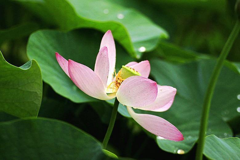 这里的荷花静放于水中,随水波漂荡,轻轻浅浅、立起足尖,仍然娇艳,或出水芙蓉、或小荷才露尖尖角,犹如翠盖佳人临水立,檀粉不匀香汗湿。一阵风来碧浪翻,珍珠落叶花更红。