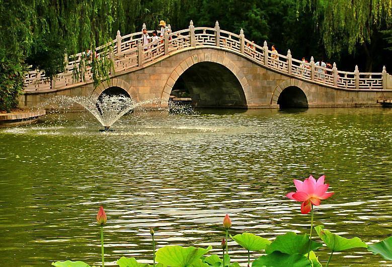 莲湖公园拥有三、四百年历史的“莲花池”。这大概是古代以荷花为主题的公园,明朝的时候,就专门开辟来种植荷花,这里的景致比其他地方美也是理所当然的。天空飘落着蒙蒙细雨,漫步公园之中,宁静的湖面上泛起了一圈圈的涟漪。成片的莲叶铺满了湖面,水面上绿油油的,含苞待放的花苞竞相探出脑袋。碧绿的荷叶一簇簇的簇拥着,既使很宽阔的水面,它们也奇怪的那样紧密的生长,如众星捧月般奉出几朵粉色的或白色的花朵,散发着淡淡的清香。