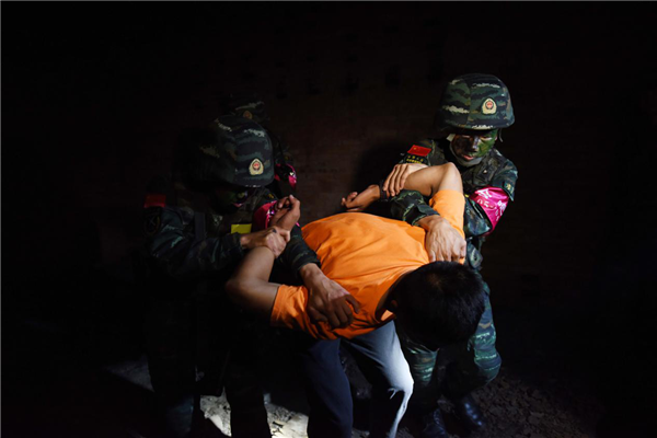 山洞一片漆黑,“暴恐分子”穷凶极恶。武警合肥支队特战小队长曾祥慰与小队成员依据地形研究决定采取“正面佯攻、侧翼突入”的战术手段捕歼“暴恐分子”,随即派出封控小组,分别从东南两侧隐蔽接近洞穴出入口,防止“暴恐分子”逃脱,突击组携警犬进入洞穴隐蔽接敌,在洞穴的一个房屋内发现并迅速突入房屋,将其制服。