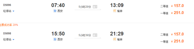 西安到榆林最快5小时29分,榆林返回最快4小时46分。