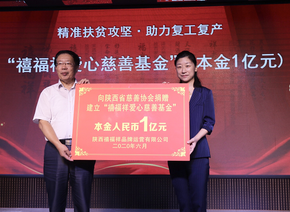 本协议为陕西禧福祥品牌运营有限公司向陕西省慈善协会捐赠设立本金为人民币1亿元的“禧福祥爱心慈善基金”,为“留本捐息”的慈善基金。基金每年按基金本金总额4%提取增值款,即人民币400万元捐赠给省慈善协会,用于慈善公益项目。 本基金是继2017年设立1亿元的“禧福祥爱心慈善基金”三年期满后的再次续签协议。该基金设立期限三年,从2020年6月起,至2023年6月底止。陕西禧福祥品牌运营有限公司财务总监杨娜与省慈善协会副会长张凤英代表各方在冠名慈善基金协议上签字;陕西禧福祥品牌运营有限公司总经理边瑞涛向省慈善协会常务副会长李荣杰递交捐赠金额展示牌;吴前进会长向王延安董事长颁发捐赠证书及纪念牌匾。
