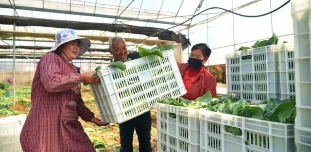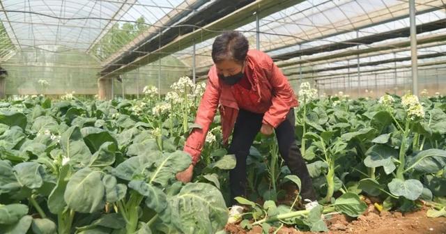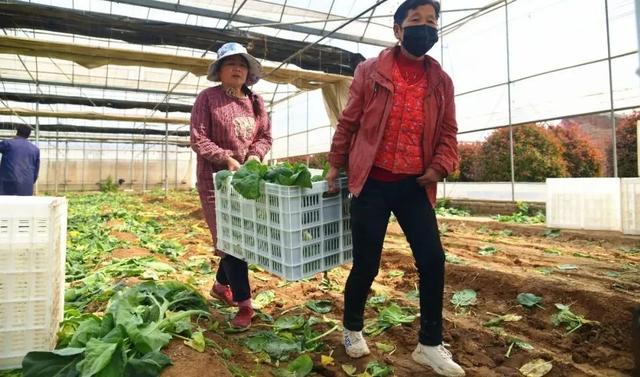 刘亚线娴熟地采收着芥蓝,不一会儿工夫,就装满了菜筐,和姐妹们抬着菜筐放到三轮车上后,又帮着三轮车师傅将装好的蔬菜转运到大棚外的货车上。刘亚线边走边擦着汗水,放好后,又回到大棚里继续采收蔬菜。