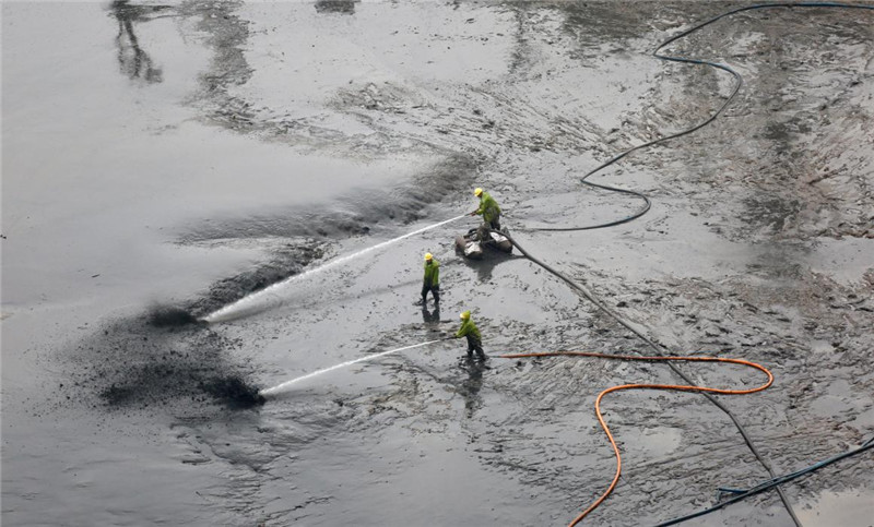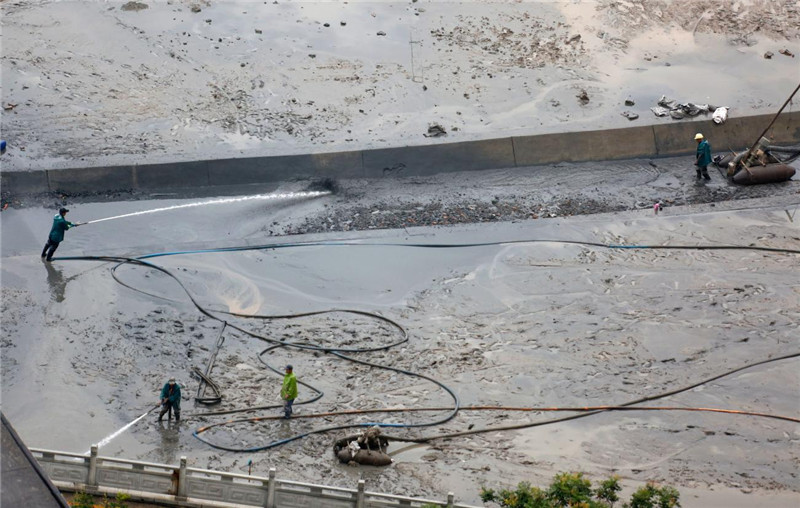7月14日,渭南市湭河水污染综合治理工程施工现场,工人师傅利用高压水枪清理淤泥。