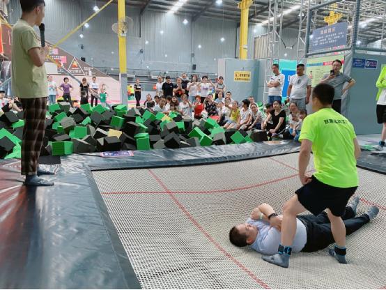 首先,活动教练为大家表演和示范了多种精彩酷炫的花式蹦床项目,如“专业跑酷”、“自由弹跳”、“公主抱”等等,大家看后都惊叹不已,纷纷鼓掌欢呼,喝彩连连。