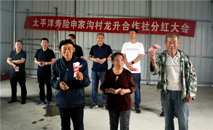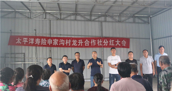 7月17日,恰逢申家沟村分红的日子,久旱的土地上天降甘霖,双喜临门。中国太保寿险陕西分公司党委委员、高级副总经理闫武辉、工会主任钟岭在榆林中支总经理刘飞及中支扶贫工作队一行的陪同下,奔赴佳县申家沟村,参加中国太保寿险申家沟村龙升合作社第三次分红大会。参加此次分红大会的还有金明寺镇党委书记贺健、金明寺镇镇长党欣、佳县卫健局副局长、村第一书记马睿、中国太保寿险陕西分公司驻村帮扶人员高飞、刘钊以及贫困户代表、村民代表。