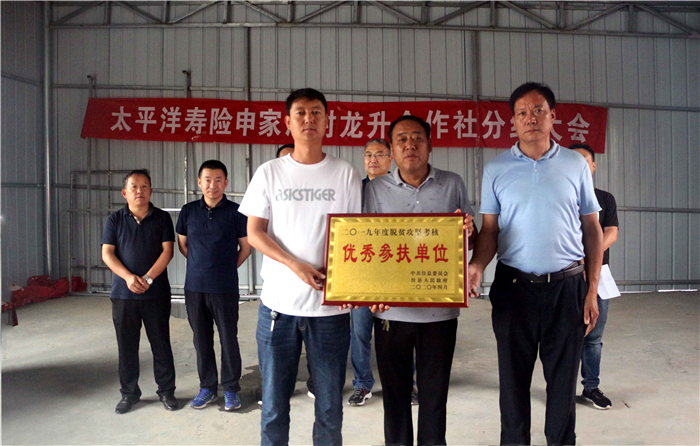 会议最后,由金明寺镇党委书记贺健代表佳县县政府为中国太保寿险陕西分公司颁发“2019年度脱贫攻坚考核参扶单位优秀奖”奖牌,并由参会领导为贫困户代表发放了分红。