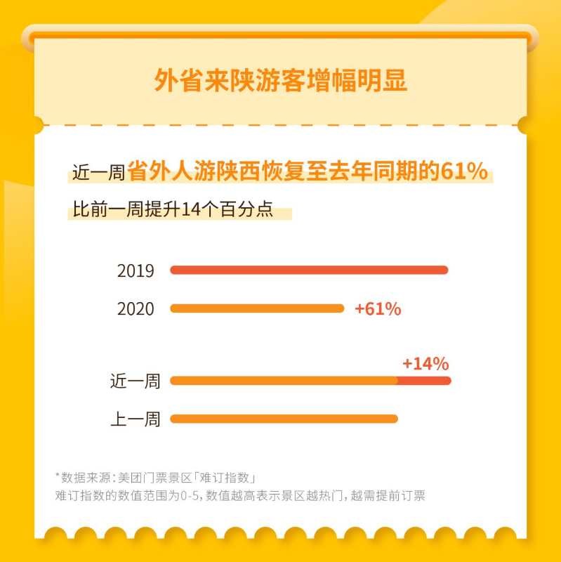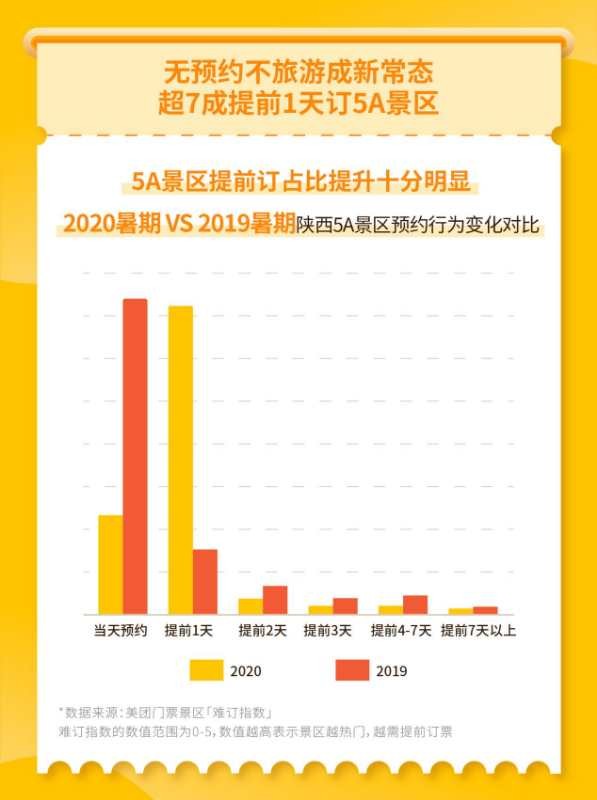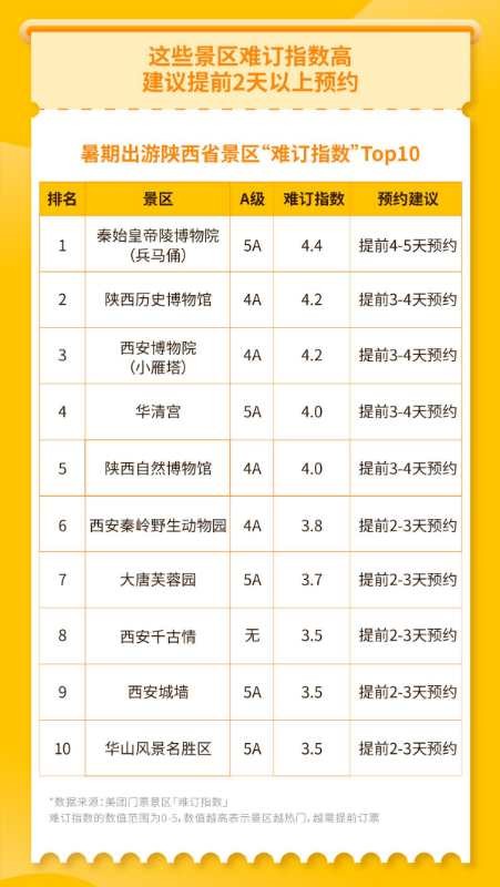 目前陕西以‘文化陕西’和‘了解中国从陕西开始’为形象标识,打造国际一流的文化旅游中心。我们期待美团点评能够将‘文化陕西’品牌标识传播出去,让更多人从了解陕西开始去了解中国。”跨省游恢复,陕西品牌馆将入驻美团推动全国人游陕西7月14日,文化和旅游部办公厅宣布在做好疫情防控工作的前提下有条件恢复跨省团队旅游“机票+酒店”业务。在此政策带动下,外省人游陕西正在成为陕西旅游复苏的新动力。美团门票大数据显示,近一周外省人游陕西的订单恢复至去年同期的61%,比前一周提升14个百分点。签约当天,陕西省文化和旅游厅宣布陕西文化旅游品牌旗舰馆将上线美团平台,让本地、异地游客通过手机一点便能获得一份涵盖陕西“吃住行游购娱”全场景的文化旅游新攻略。陕西超200家景区通过美团绿色通道实现门票预约在陕西省文化和旅游厅的指导和支持下,美团点评还将面向陕西旅游景区开设门票预约绿色通道,通过美团券、门票预约系统等大数据技术手段帮助景区快速实现互联网售票、预约售票、分时预约等便民服务。景区只需通过美团商家后台申请或电话联系美团业务经理,便有专门的美团技术人员服务对接安装系统,最快3天便可实现互联网预约售票。景区还可以申请大数据看板服务,实时了解线上售票情况和入园情况,随时调整限流防控措施,保障游客安全游览。截止目前,陕西省内已有秦始皇帝陵博物院、西安博物院、大唐芙蓉园等两百余家景区通过美团门票预约绿色通道实行网络预约、分时预约等便民服务。在提供预约便利的同时,美团还联手陕西热门景区推出“Fun暑假放肆玩”暑期大促专题,为消费者暑期出游带去更多实惠:原价300元的《西安千古情》演出贵宾席成人票,现市民专享99元,还有华清宫景区、曲江海洋极地公园、乐华欢乐世界等多家热门景区学生票专属特惠活动,最低6折起。陕西成暑期热门目的地,秦始皇帝陵最“难订”面对即将到来的暑期出游小高峰,陕西省文旅厅与美团点评共同发布《陕西省暑期“无预约不旅游”报告》(以下简称《报告》),利用“难订指数”等大数据模型分析预测陕西省暑期预约旅游消费趋势,指导游客如何更加从容便利地打卡陕西热门旅游目的地。《报告》显示,“无预约不旅游”已成今年出游新常态,今年暑假期间,提前1天在美团App上预约陕西省5A景区的占比超71%,比去年同期提前1天占比提升超3倍。其中,学生是主力消费人群,超50%的90后会选择手机提前预约门票。同时,限流管控叠加暑期出游高峰也促使不少热门景点门票出现不同程度的紧张局面。根据美团景区难订指数分析,7月下旬陕西省将进入暑期出游高峰,8月初会达到门票预约峰值。其中周末预约将最为紧张,建议有暑期出游计划的游客尽早通过手机预约门票。哪些景区门票较为紧张难订?在暑期出游陕西景区“难订指数”Top10榜单中,秦始皇帝陵博物院将成为陕西省门票最紧张景区,难订指数达4.4,建议有前往计划的游客提前4-5天上美团App进行预约。(记者 李卫)