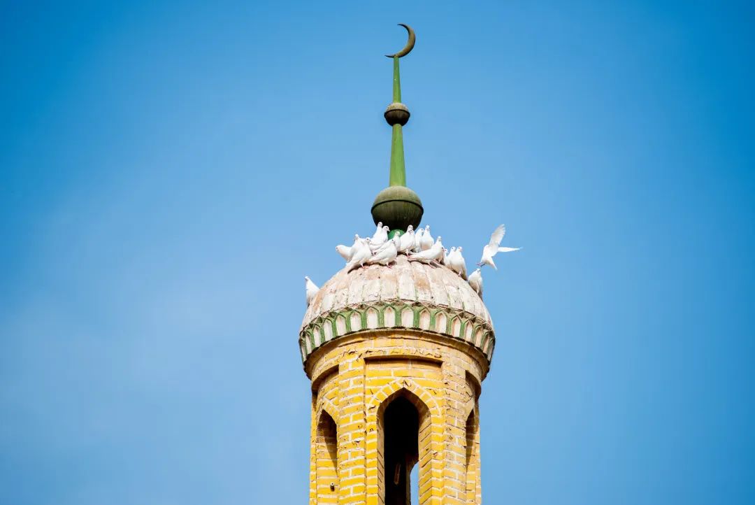 寺庙的塔尖上,总是有很多鸽子停留,与喀什蓝蓝的天和美丽的清真寺一起,构成一幅美好的画面。