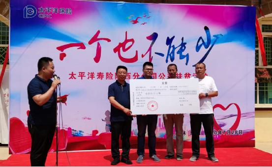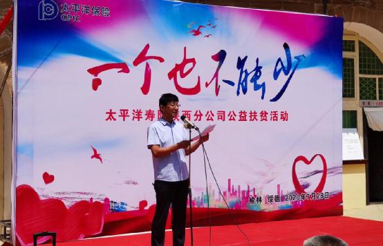 7月28日,中国太保寿险陕西分公司、榆林中心支公司内外勤伙伴及爱心客户共计80余人前往榆林市绥德县张家峰村开展“一个也不能少”扶贫公益活动。为张家峰村村民现场捐赠人民币15万元,用于建设“幸福苑”餐厅,与当地镇政府一起为孤寡老人解决每日的用餐问题。