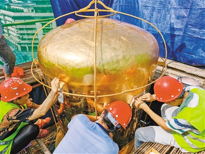 维修工人正在为钟楼宝顶重新贴上金箔。目前修缮工作已接近尾声,8月26日有望恢复参观。 (首席记者 王健 摄)