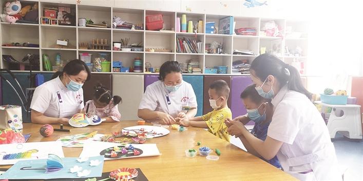 康复治疗师带领残疾儿童做手工。