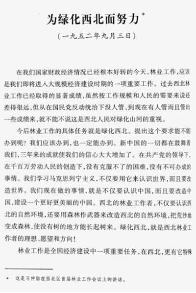 习仲勋在西北区首届林业工作会议上的讲话《为绿化西北而努力》(收入《习仲勋文集》)