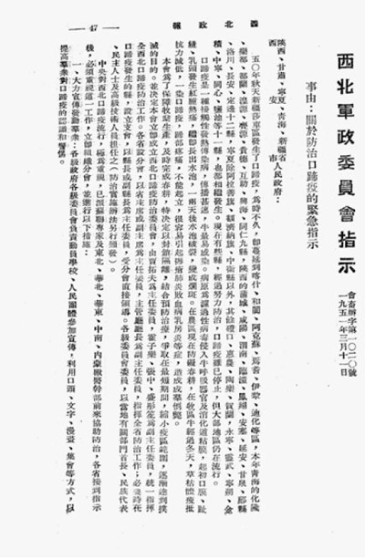 西北军政委员会《关于防治口蹄疫的紧急指示》
