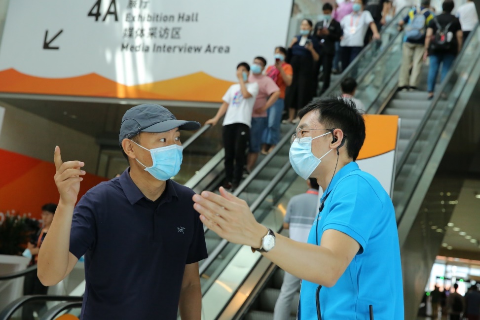 “您客气了,大爷,我们也是志愿者。我们太保的展台在E4口,您可以进去看看,体验一下我们的智能服务”