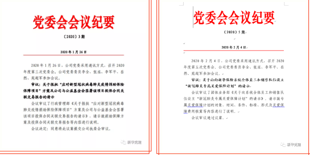 周密研究部署防控举措。1月26日,公司党委采用通讯方式召开2020年度第三次党委会,研究审议了《关于报批“应对新型冠状病毒肺炎疫情捐助保险保障项目”方案及公司与公益基金会签署该项目投保合同关联交易报告的请示》。2月上旬至中旬,公司党委又先后召开5次党委会,学习贯彻习近平总书记关于疫情防控和统筹经济社会发展的一系列重要讲话指示精神,研究落实中投公司工作部署,统筹推进公司系统疫情防控和复工复产,并专题研究向武汉一线医务人员捐赠保险、向湖北分公司划拨党费、扩展15款产品保险责任、员工关爱保障计划等事项。