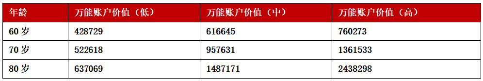 注:万能账户价值按照假设的结算收益计算,低、中、高三档结算收益假设分别为2.0%(最低保证收益)、4.5%、6.0%
