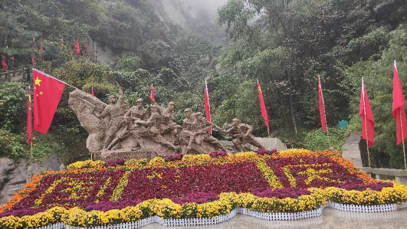 10月1日,华山景区内五星红旗迎风飘展,由红色、黄色鲜花拼绘成的偌大“国庆”二字,更为景区增添了浓浓的节日气氛。