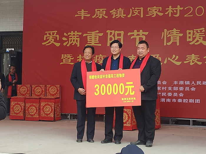 10月24日,临渭区教育局、丰原镇闵家村两委在闵家村村部隆重举行“爱满重阳节 情暖老人心”2020年重阳节暨老人节庆祝活动。区教育局党工委书记、局长邢唯远,丰原镇党委书记刘晓亮、副书记张丽,区教育局副局长李学斌、工会主席李旗,闵家村村委会干部、群众共同陪伴闵家村182名70岁以上老人欢度重阳节。