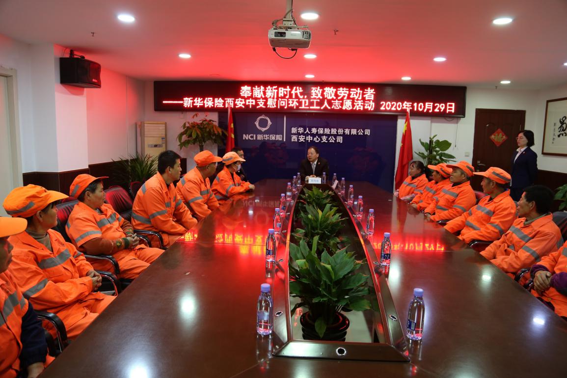 活动中,西安中支邀请环卫工人走进职场,向他们介绍了新华保险公司的发展历程、品牌文化以及责任使命,详细讲解了“城市因你而美·新华伴你而行——新华保险关爱全国环卫工人大型公益行动”项目内容,让环卫工人感受到来自社会的关心与温暖,相信新华保险永远是他们坚强的后盾。西安中支总经理殷海峰向辛勤劳动的环卫工人们致敬,感谢他们不畏严寒酷暑,不怕脏不怕累,宁愿一人脏换来万家净,为营造整洁美观的城市环境作出的积极贡献,同时叮嘱他们防寒保暖,确保自身的健康和安全。