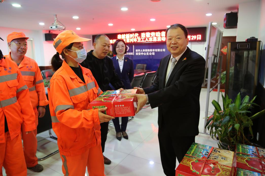 10月29日,新华保险西安中支组织开展“奉献新时代,致敬劳动者”环卫工人关爱活动。陕西分公司副总经理兼西安中支总经理殷海峰及部分志愿者代表,为中山门街道的环卫工人代表送上爱心水果,表达来自新华保险西安中支的敬意与关爱。
