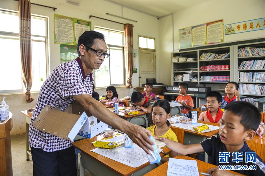 在广西武宣县二塘镇双桂小学,老师韦旭禧给学生们发牛奶(6月19日摄)。新华社记者 曹祎铭 摄