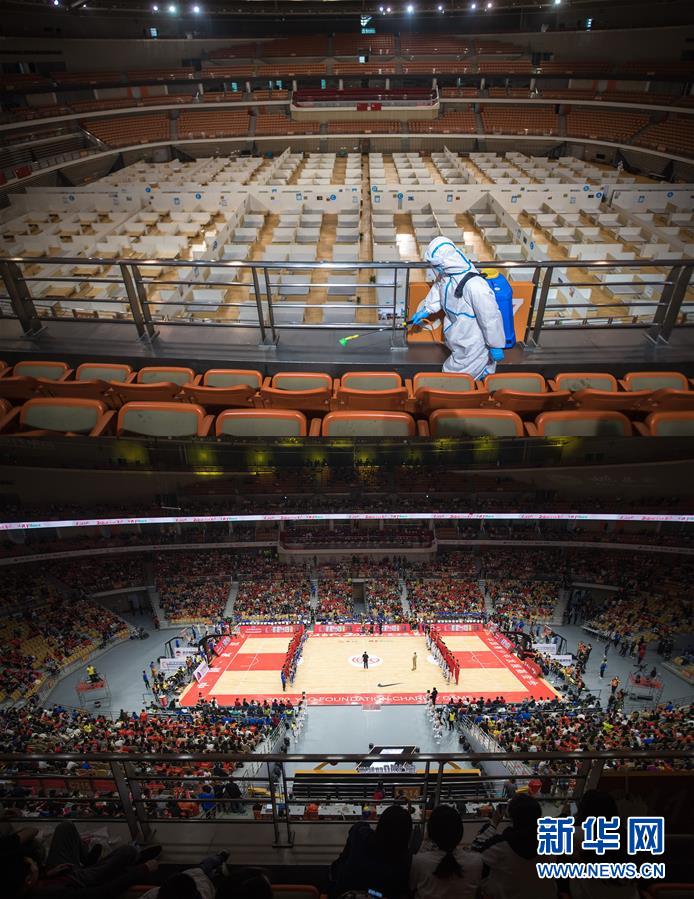 拼版照片上图:3月8日,武汉体育中心方舱医院送走最后一批痊愈患者,正式休舱。随后,舱内进行全面消毒工作。这是志愿者在进行消杀作业。下图:10月4日,武汉体育中心方舱医院休舱后举行首场大型赛事。 (配本社同题文字稿) 新华社记者 肖艺九 摄