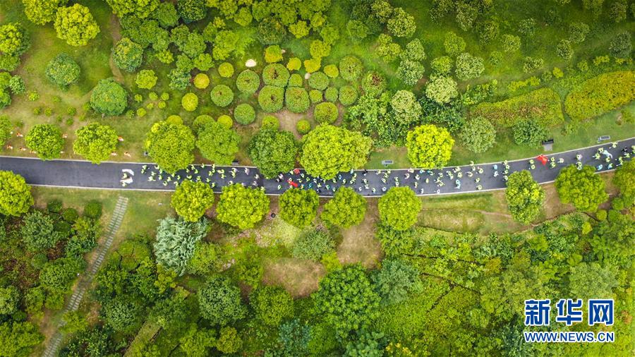 在江苏省淮安市,体育爱好者在淮安森林公园进行“全民健步走”活动(8月7日摄,无人机照片)。新华社发(干石泉 摄)