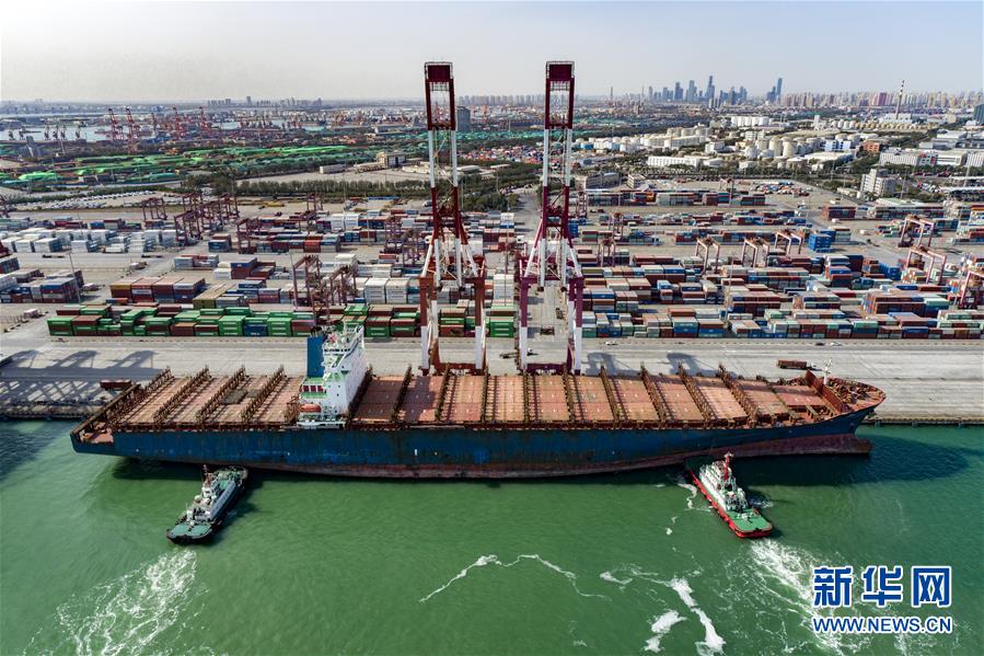 10月27日,一艘货轮停靠天津港。天津港集团正式开通运营今年第四条“一带一路”新航线(无人机照片)。新华社发