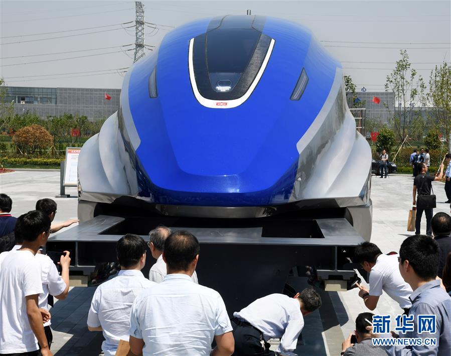 在山东青岛,人们在时速600公里高速磁浮试验样车下线仪式上参观(2019年5月23日摄)。新华社记者 李紫恒 摄