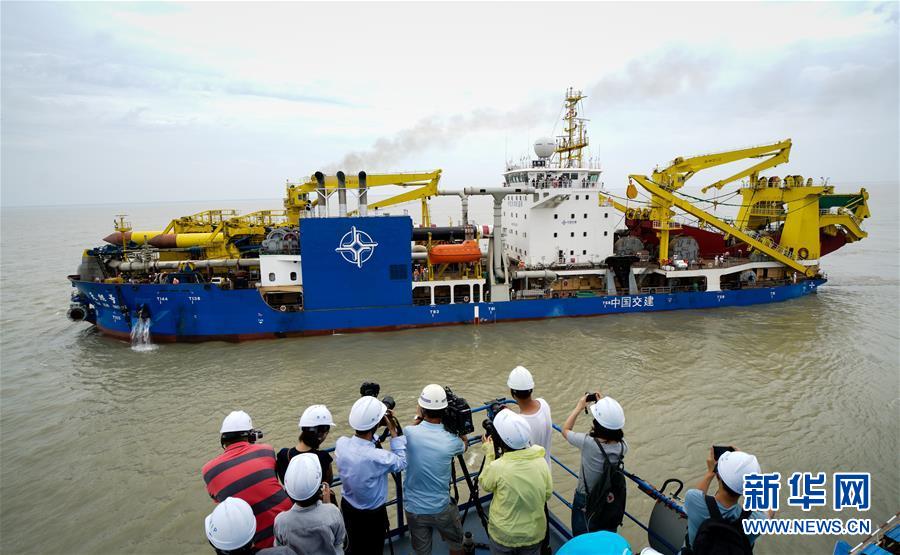 在江苏启东,“天鲲号”自航绞吸挖泥船驶离码头出港海试(2018年6月8日摄)。新华社记者 李响 摄