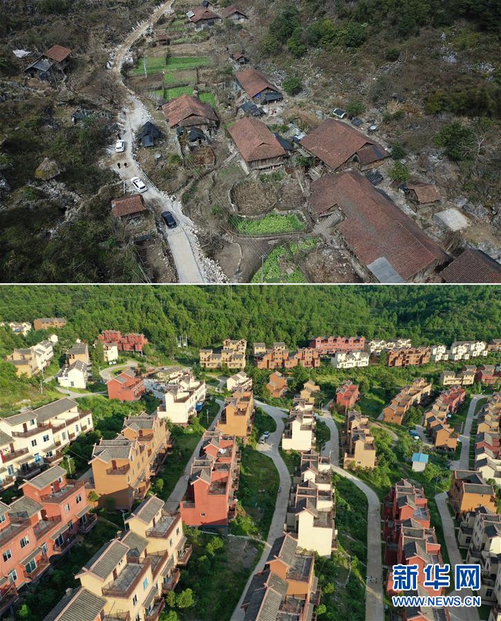 拼版照片上图:这是整屯搬迁前的广西南丹县里湖瑶族乡董甲村么干屯(2018年1月10日摄)。村民们都搬迁到“千家瑶寨·万户瑶乡”里湖王尚易地扶贫搬迁安置点。下图:这是广西南丹县“千家瑶寨·万户瑶乡”里湖王尚易地扶贫搬迁安置点(8月4日摄,无人机照片)。新华社记者 周华 摄