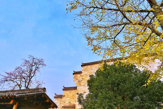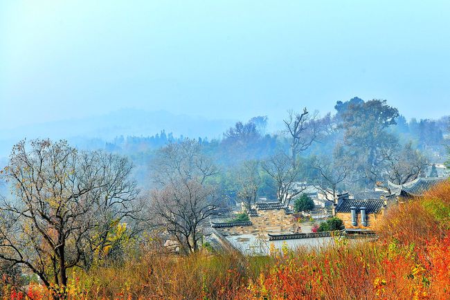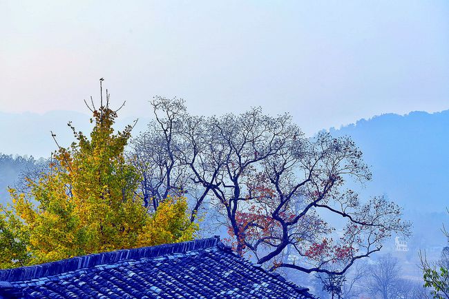 红叶丛中忽露出飞檐翘角,粉墙黛瓦在金黄叶子的掩映下,呈现出山水画般的诗情画意。