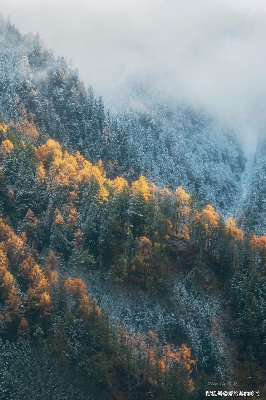 红叶绚烂多彩,万树姹紫嫣红,青松苍翠,雨雾中,秋色漫山遍野,雪后,秋叶雪山湖泊又相得益彰......金秋醉人的感觉油然而生。
