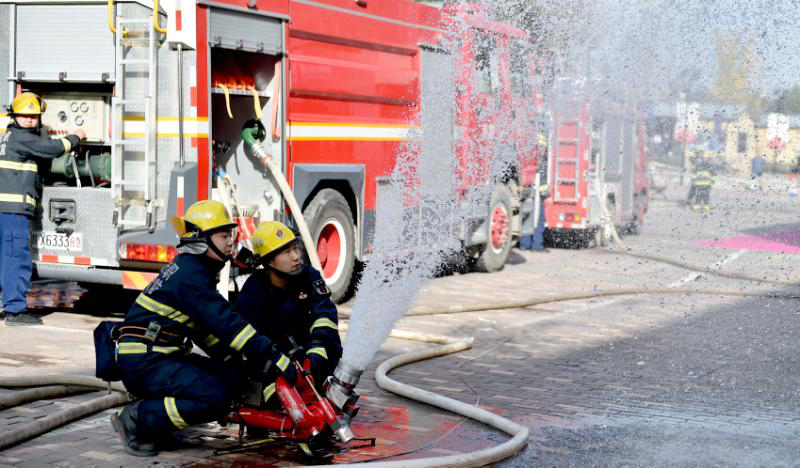几分钟后,7辆消防车抵达着火地点,随即现场指挥员、侦检组、内攻组、登高车、50米高喷车、25吨水罐车进行了一系列科学有序的快速配合,将大楼内几十名“被困群众”救至安全区域,并将火势扑灭。