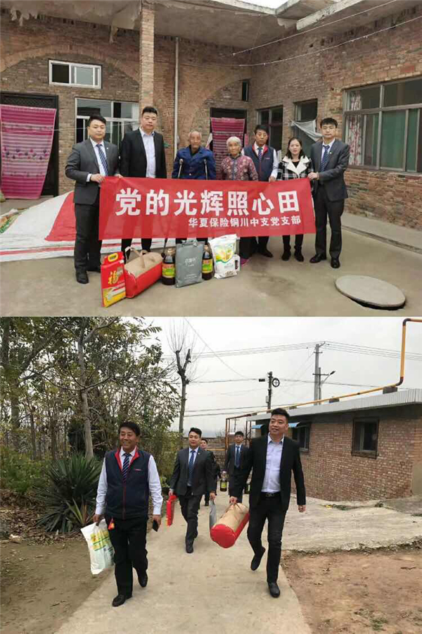 华夏保险铜川中支中支总经理张巍同志及部分党员一行7人深入困难老人家中,为其送去米、面、油等生活物资,并与老人们拉家常,询问他们家庭、生活和健康状况,倾听他们的心声,提醒他们注意身体健康,以此谨代表铜川中支党支部的深切关怀和热切慰问。