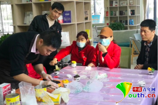 西安市莲湖区残疾人创业孵化服务中心残疾人学习制作甜点。中国青年网记者李慧慧 摄