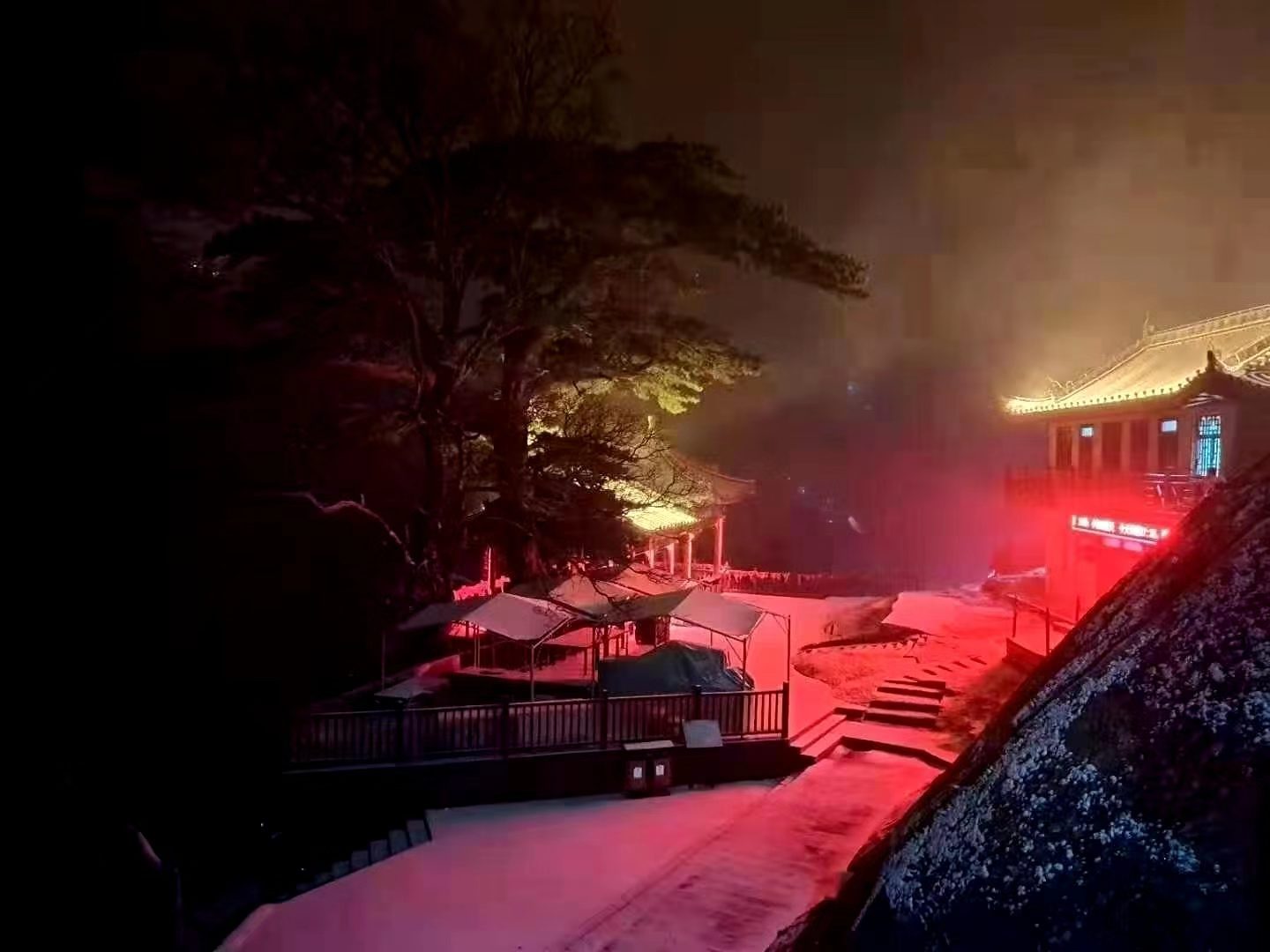 据了解,此次降雪是华山景区入冬来首场降雪,从11月20日下午6时至21日8时,华山景区降水量6.5毫米,最大雪深3厘米。目之所及,灯光映照中的天空,是纷纷扬扬、规模宏大的雪花,树梢、树冠、树杈上都披上了银装。
