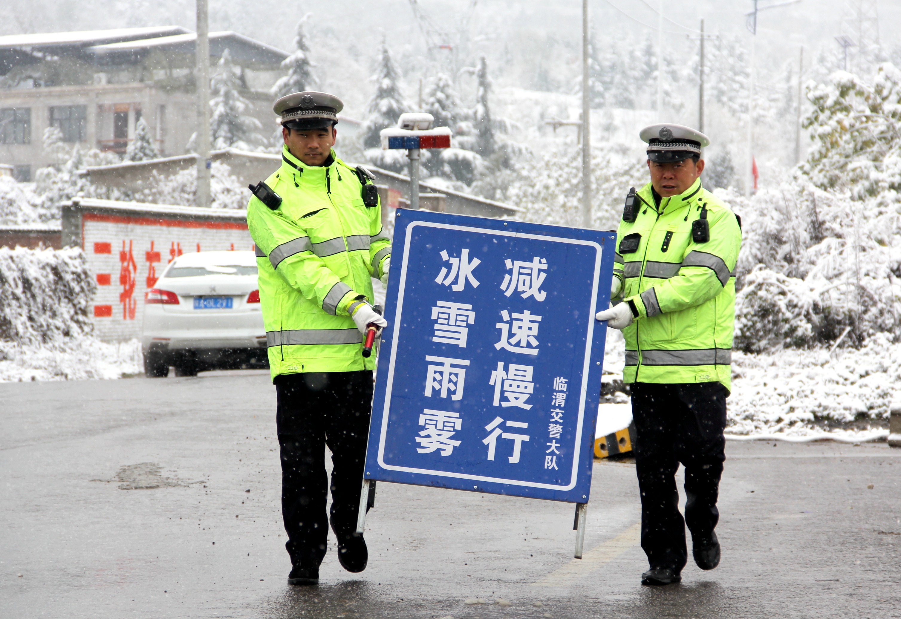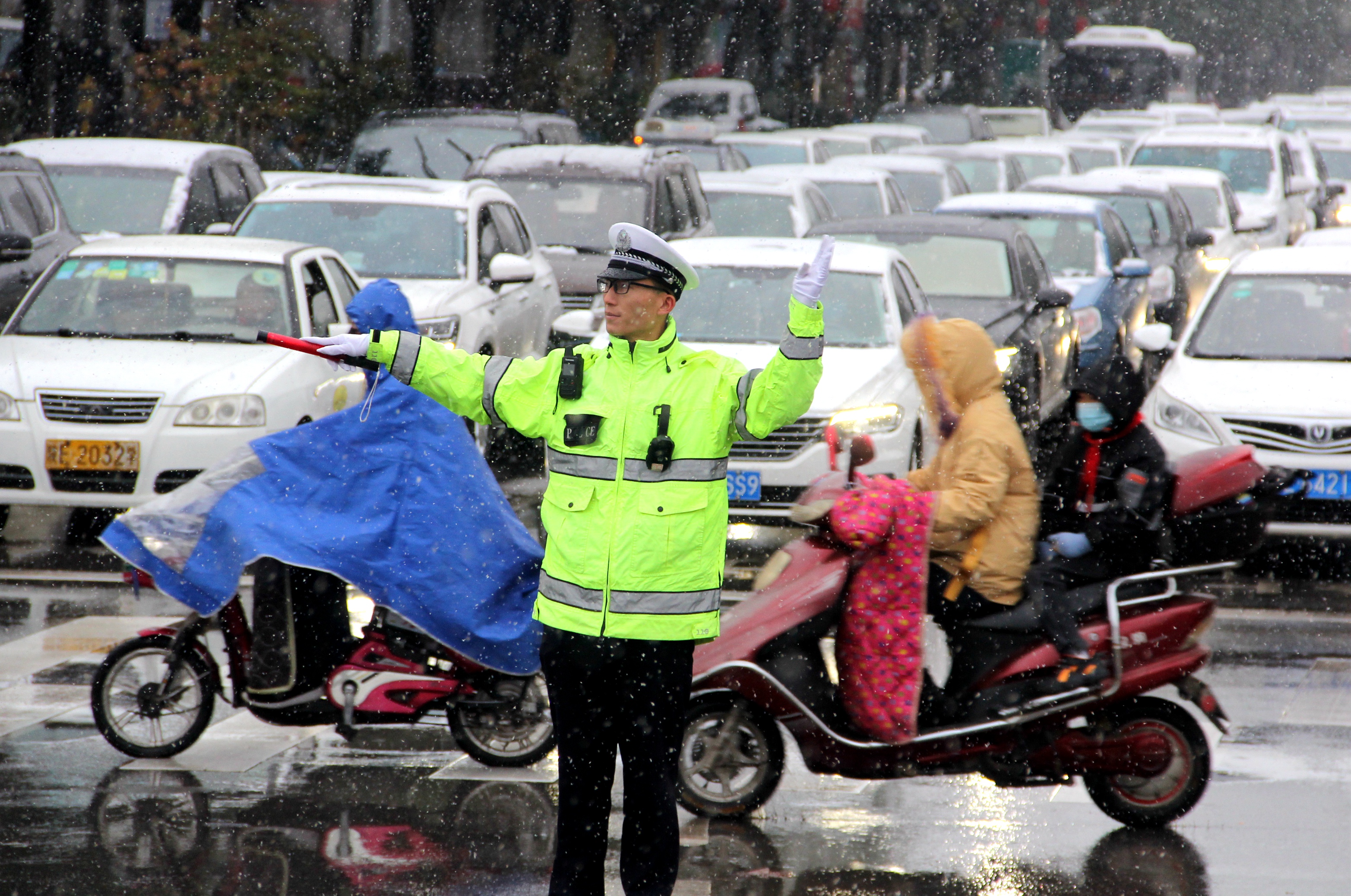 11月23日,为保障雨雪天气群众安全出行,渭南市公安局交警支队临渭大队民警闻雪即动,在城区十字路口指挥车流,护送学生,在国省县乡道路、坡道弯路、桥梁涵洞等处设置提示牌,检查校车、客车安全设施,喊话提醒减速慢行,全力防事故,确保广大群众平安出行。(通讯员 张亮)