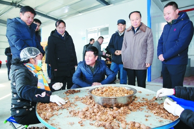 郭大为在杨山村核桃加工厂与务工人员亲切交谈。记者 鲜康 摄