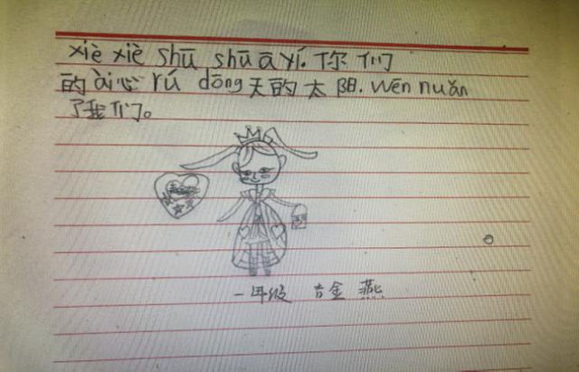 这是一封来自大山的信,是太平洋保险南山傈僳族乡希望小学六年级学生蔡佳欣写给志愿者老师的。在新年到来之际,蔡佳欣和她的28名同学,一起给中国太保和志愿者老师写来了信,讲述了他们的学习和生活,用最朴实的语言,表达对中国太保的感谢和对志愿者老师的思念,送上新年的祝福。5位一年级的小朋友,不会写太多的字,就用拼音和图画代替,在信里出现最多的词就是“温暖(wen nuan)”,太保志愿者老师在学校期间让他们感受到了阳光一般的温暖。高年级的同学回忆起了英语课、手语舞、无人机和那场小小运动会,这些课程和老师们说的话,深深留在他们的记忆里。