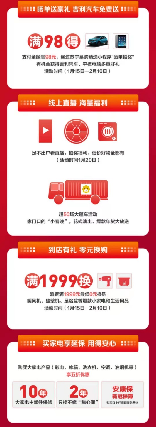 面对消费群体过年换新的需求,零售云年货节主打家电、手机的以旧换新力度,提高收旧补贴价格,把新款、爆款潮流家电带到乡镇,让乡亲们宅家也能过个舒服年,并提供老小区上门收旧、老人家电手机使用教学、产品基础售后等服务。