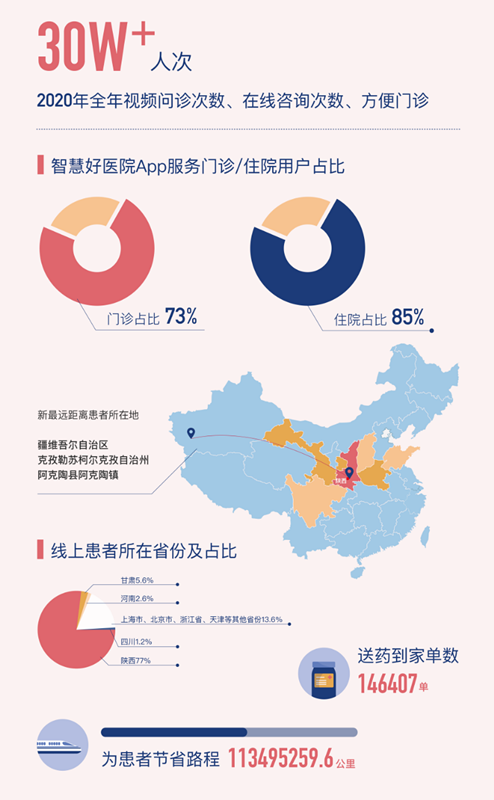 据统计,西安交大一附院2020年通过智慧好医院App为73%的门诊患者以及85%的住院患者提供服务。其中,通过视频问诊、在线咨询、方便门诊功能,提供线上诊疗超30万人次;完成送药到家146407单。