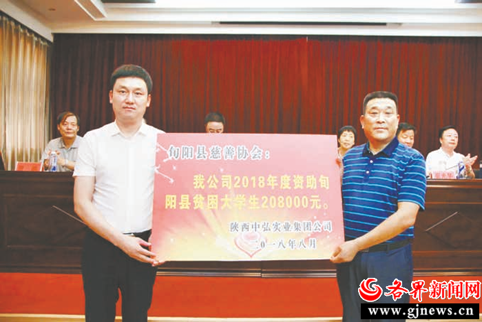 2018年8月,省政协委员、陕西中弘实业集团有限公司董事长徐浩向旬阳县贫困大学生捐赠善款。