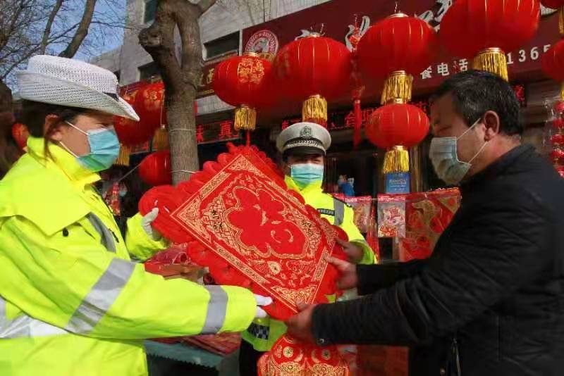 1月26日,合阳交警在集市宣传交通安全。为了确保群众安全过节,合阳县公安局以“平安春运交警同行”为主题,开展点对点、面对面交通安全大宣传活动,切实提高群众安全防范意识,预防和减少道路交通事故发生。(通讯员 刘晓红)