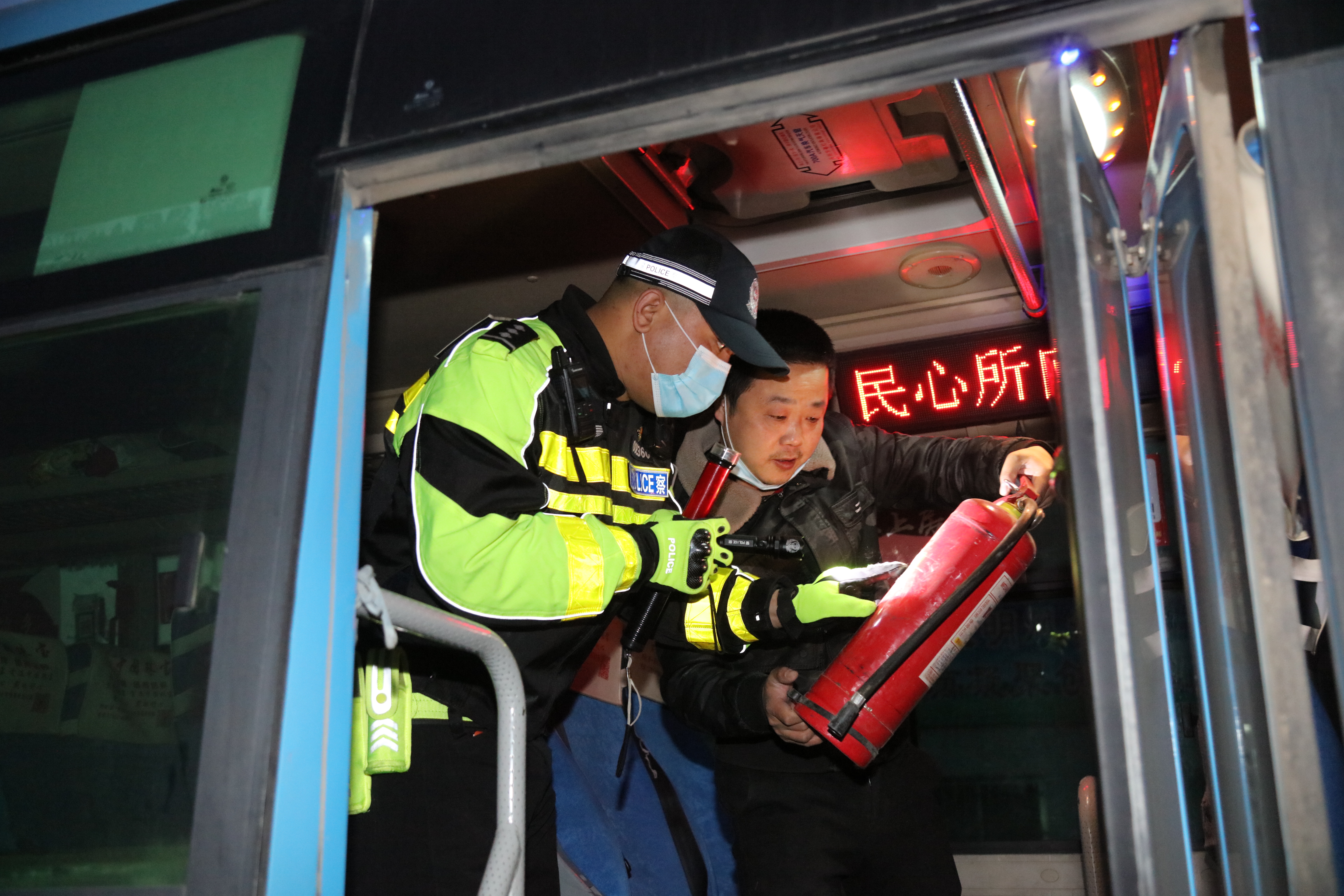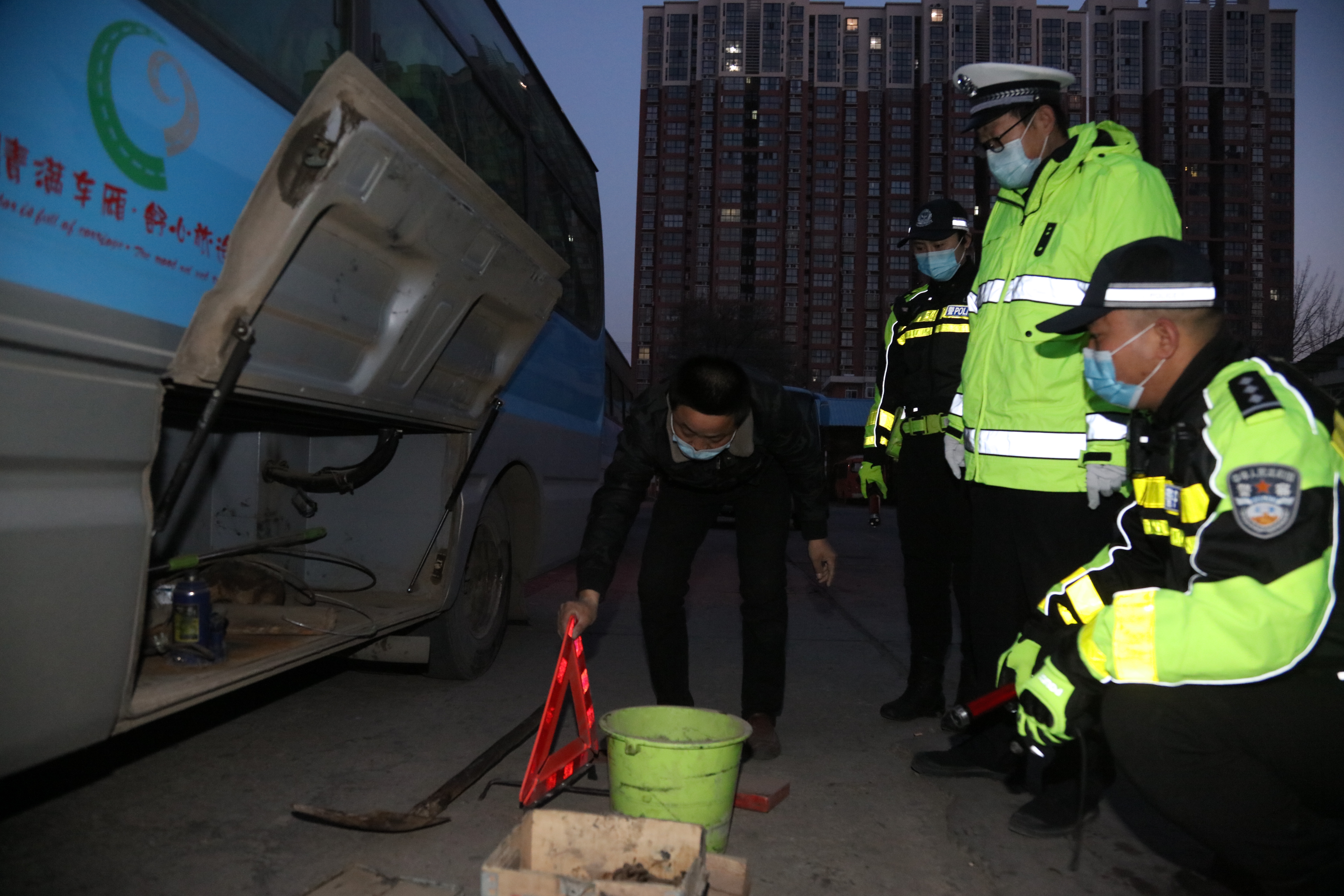 2月3日,临渭交警特勤中队黎明时分,抢在公交车发车时刻,对每一辆客运车辆进行突击检查,对事故隐患开展清零行动。